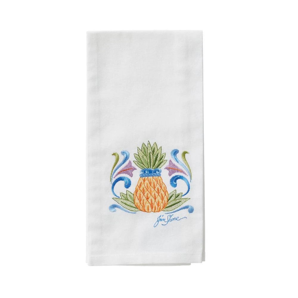 This attractive Jim Shore design is stitched into a cotton tea towel. The colorful artistic threading makes this towel a beautiful and functional gift. The embellished pineapple embroidery framed with color is delightful enough for daily use.