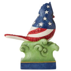 Perched on a stage of stars, this American flag painted cardinal boasts its plumage proudly with patriotism. Whistling cheerfully, striped and starred feathers distinguish the bird in shades of red, white, and blue. Freedom rings between his wings.
