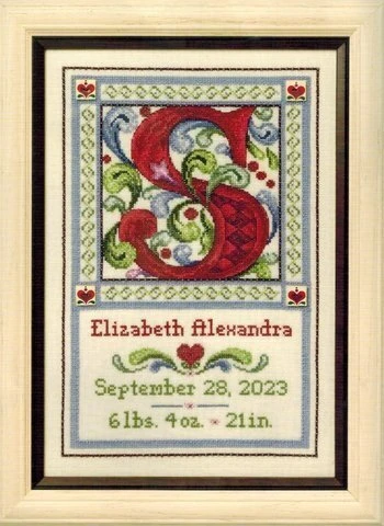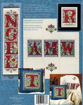40 page, soft cover publication. Small alphabet and numbers included for personalization. Various border, motif and layout alternatives will make the designs your own. Also includes a birth/Wedding sampler. Designed by Jim Shore. Stitch Count for Monograms is 87W x 87H. Stitch Count for Birth/Wedding Announcement is 123W x 191H. Stitch Count for Pillow Monogram with Border is 115W x 115H. Stitched using DMC floss, Mill Hill beads and buttons. (87034 hearts desire blue button)