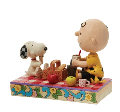 This Peanuts creation by Jim Shore shares an adorable scene of Charlie Brown, Snoopy, and Woodstock sharing a picnic. Sitting on a red patchwork blanket, the trio enjoys the weather as they share stories of adventure and friendship.